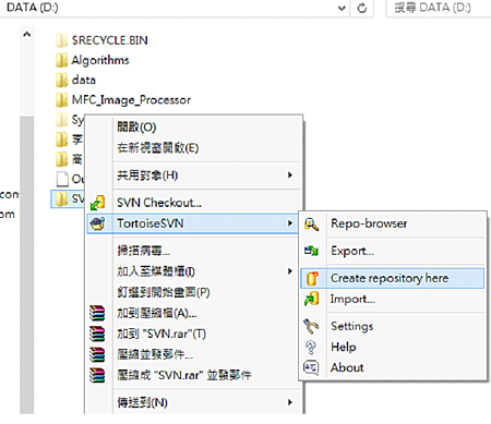 3.對這個資料夾按滑鼠右鍵選擇「TortoiseSVN」→「Create repository here」。