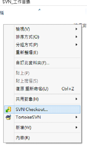 6.進入工作目錄的資料夾,進入後按滑鼠右鍵選擇「SVN checkout」,確認路徑是否正確,所謂的checkout就是將資料從檔案庫取出,SVN支援多種通訊協定,可使用http://或svn://的方式,這邊因為直接建立於系統中,於是使用File:///的方式。