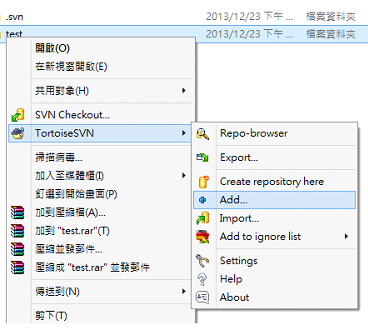 8.對test資料夾按右鍵選Add,Add只是告訴SVN這些檔案需要版本管理,還沒有真的進入到SVN檔案庫。