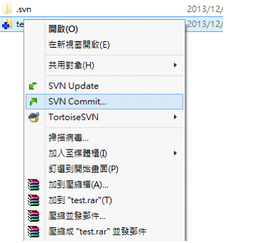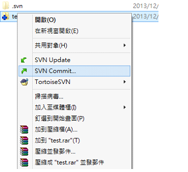 2.同樣在檔案上按右鍵,選擇Commit將資料存入檔案庫,這邊在log處寫上"這是版本2.0"。