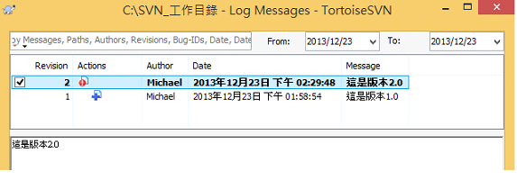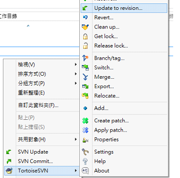 1.有時需要取回某一次的版本資料,在工作區域內按右鍵→TortoiseSVN→Update to revision。